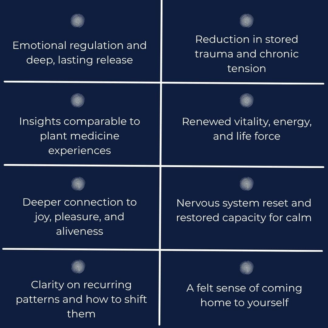 Immersive, multi-dimensional breathwork that bypasses the analytical mind and accesses the body's deep intelligence — producing states comparable to plant medicine experiences, without substances.